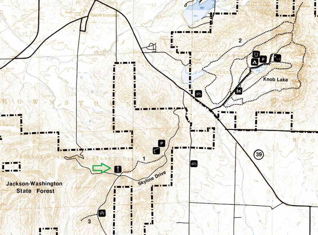 There are two tower sites in Jackson-Washington State Forest. Skyline is the normal metal fire tower that still stands. Long ago, there was a wooden observation tower at a different location in the eastern part of the forest.