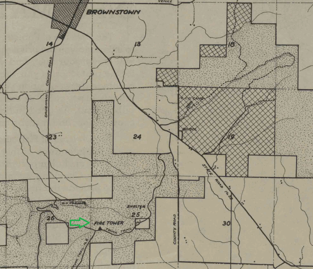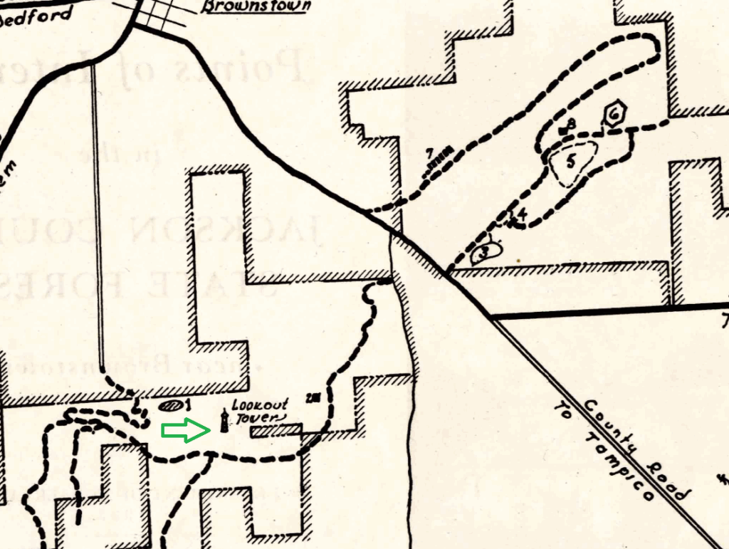 One of the other survey pages says this about the tower: “Built by Department of Conservation. Jackson County State Forest established 1931. Forty foot wooden fire tower erected on hill “near Brownstown”. A few years later, the Civilian Conservation Corps (CCC) erected a much higher steel fire tower to the south which still stands.”