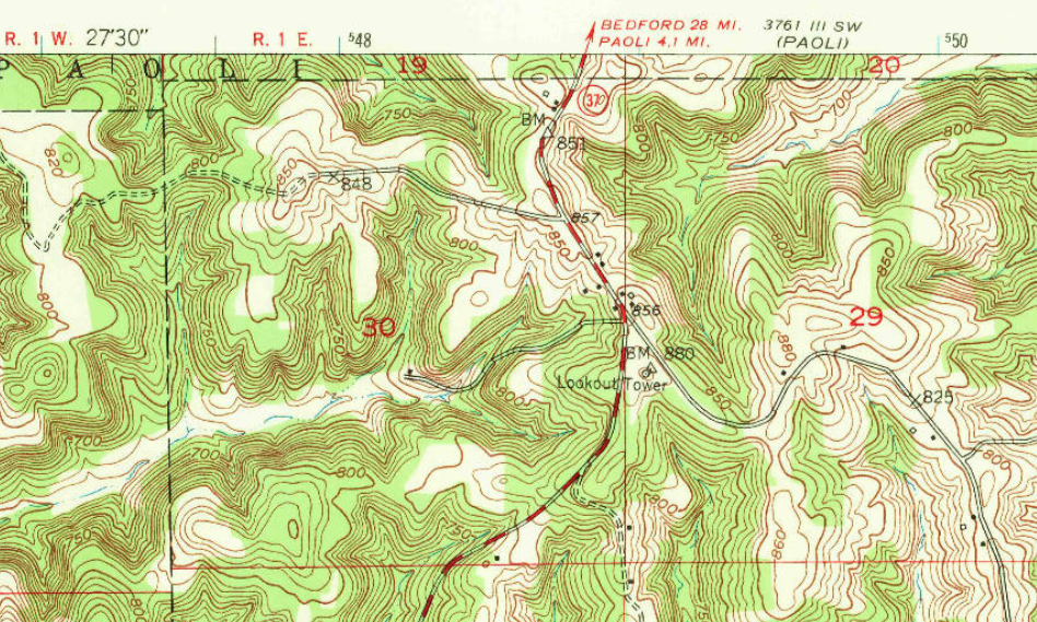 This is the only tower site I’ve found in Orange County using topo maps. I imagine that this tower site is referred to as Paoli, Valeene, and possibly Orange. National Geodetic Survey mark calls it PAOLI. For what it’s worth, Google Maps has ‘Valeene Fire Tower’.