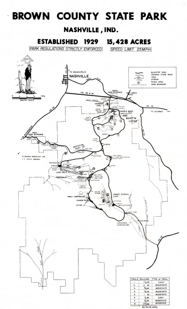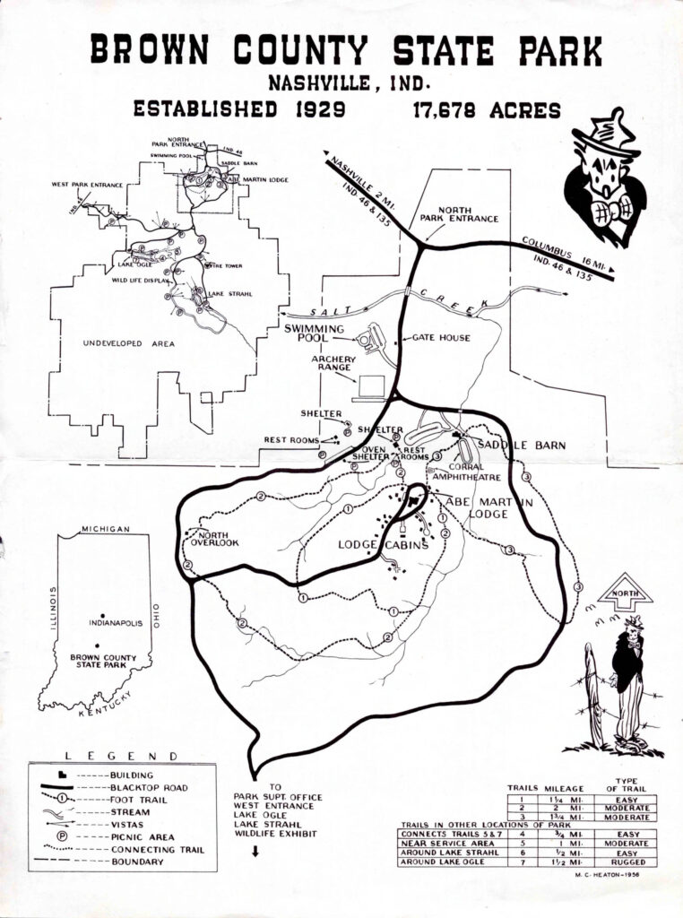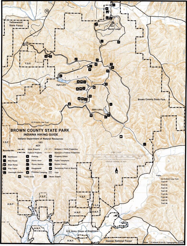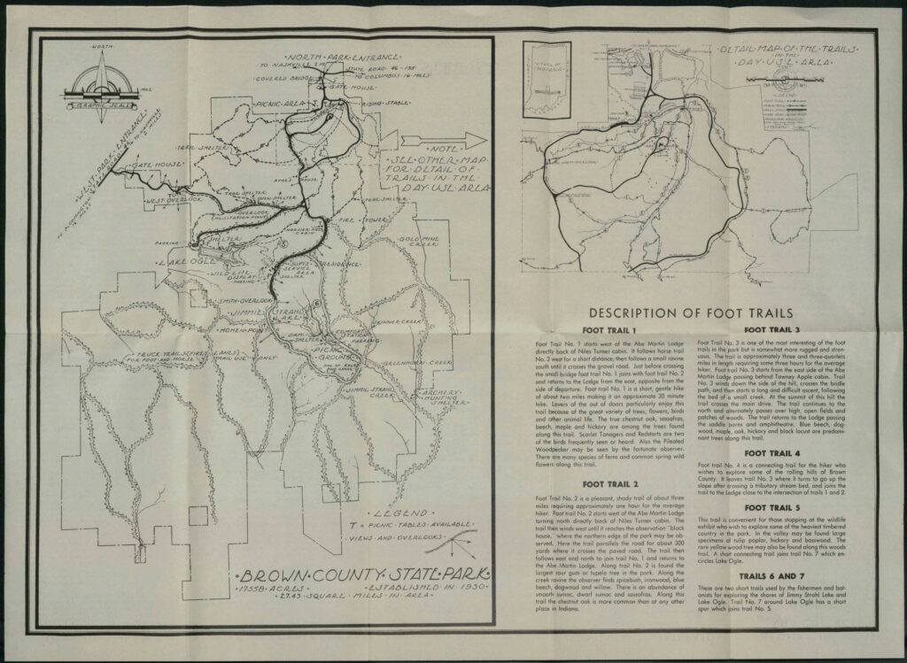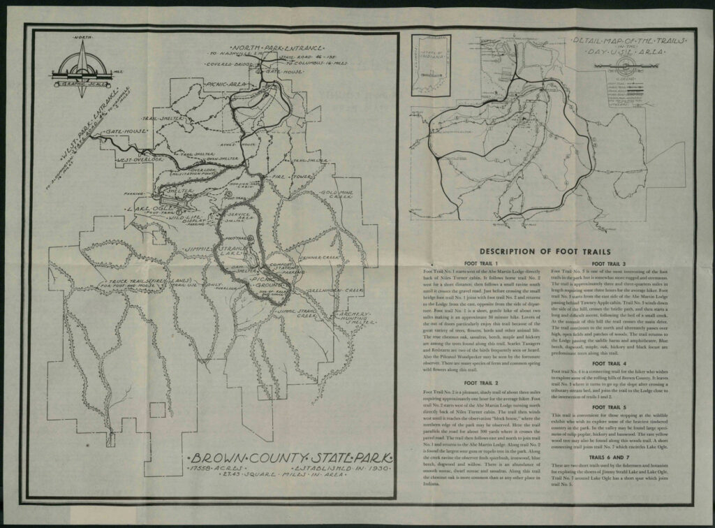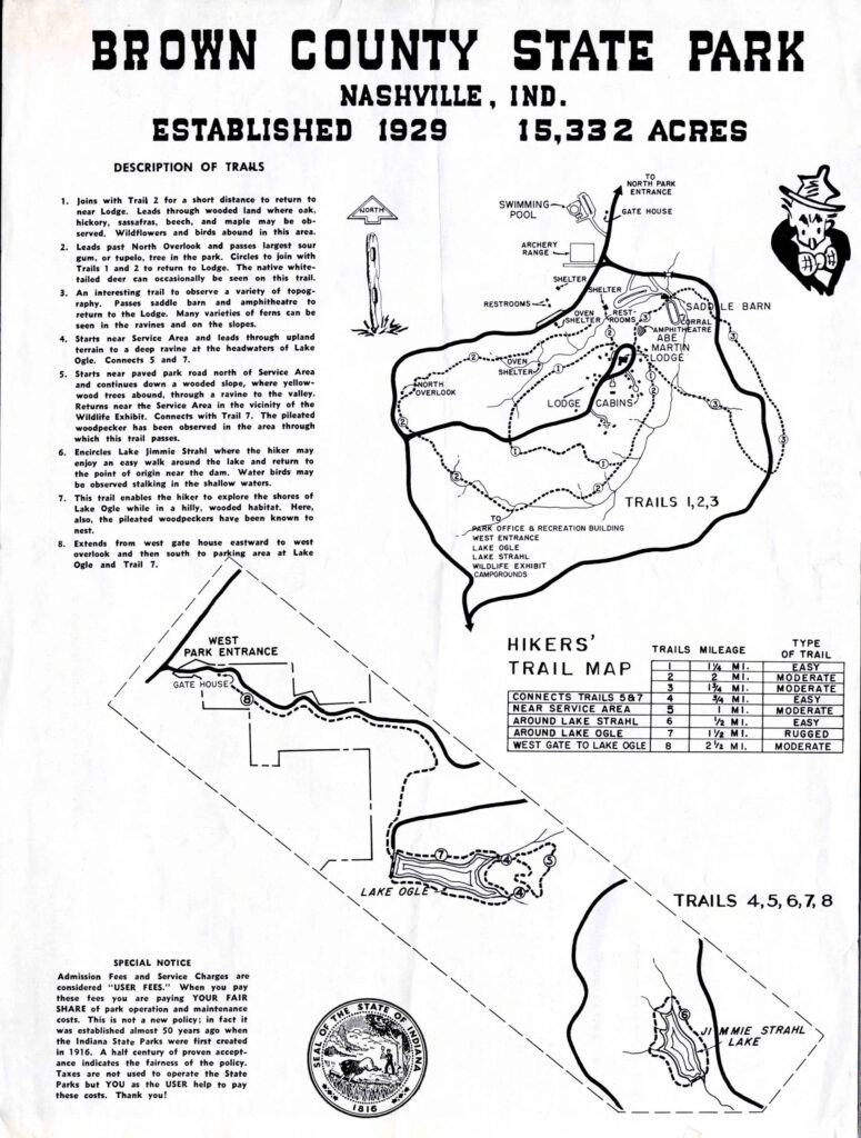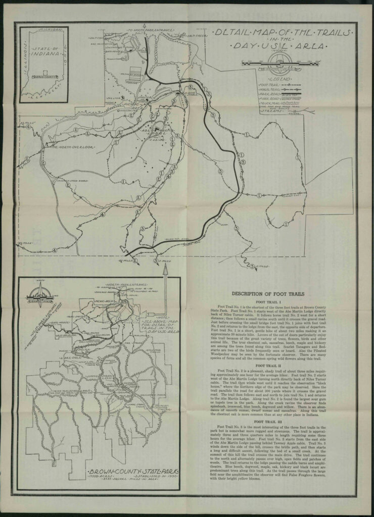 First of all, the trails at Brown County State Park have changed. In particular trails 1, 2, and 3 around the Abe Martin Lodge have changed a lot over the years. There are also long-gone trails like the one from the Lodge to the fire tower, which one can still find remnants of if you know where to look.